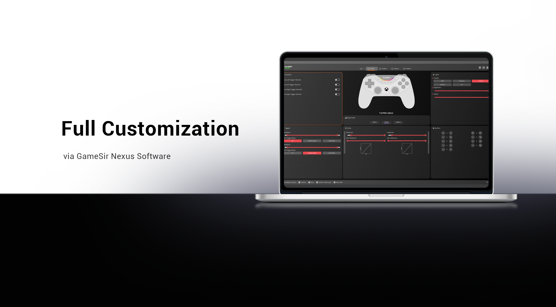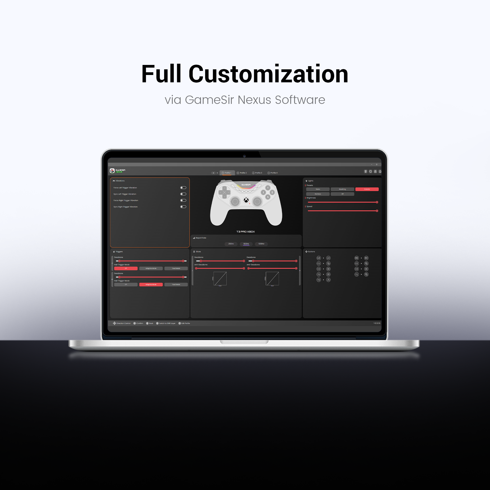 Customize your Tarantula Pro for Xbox with the GameSir Nexus software on both Xbox and PC: remap buttons, adjust stick and trigger ranges, set vibration levels, and save personalized profiles for every game.