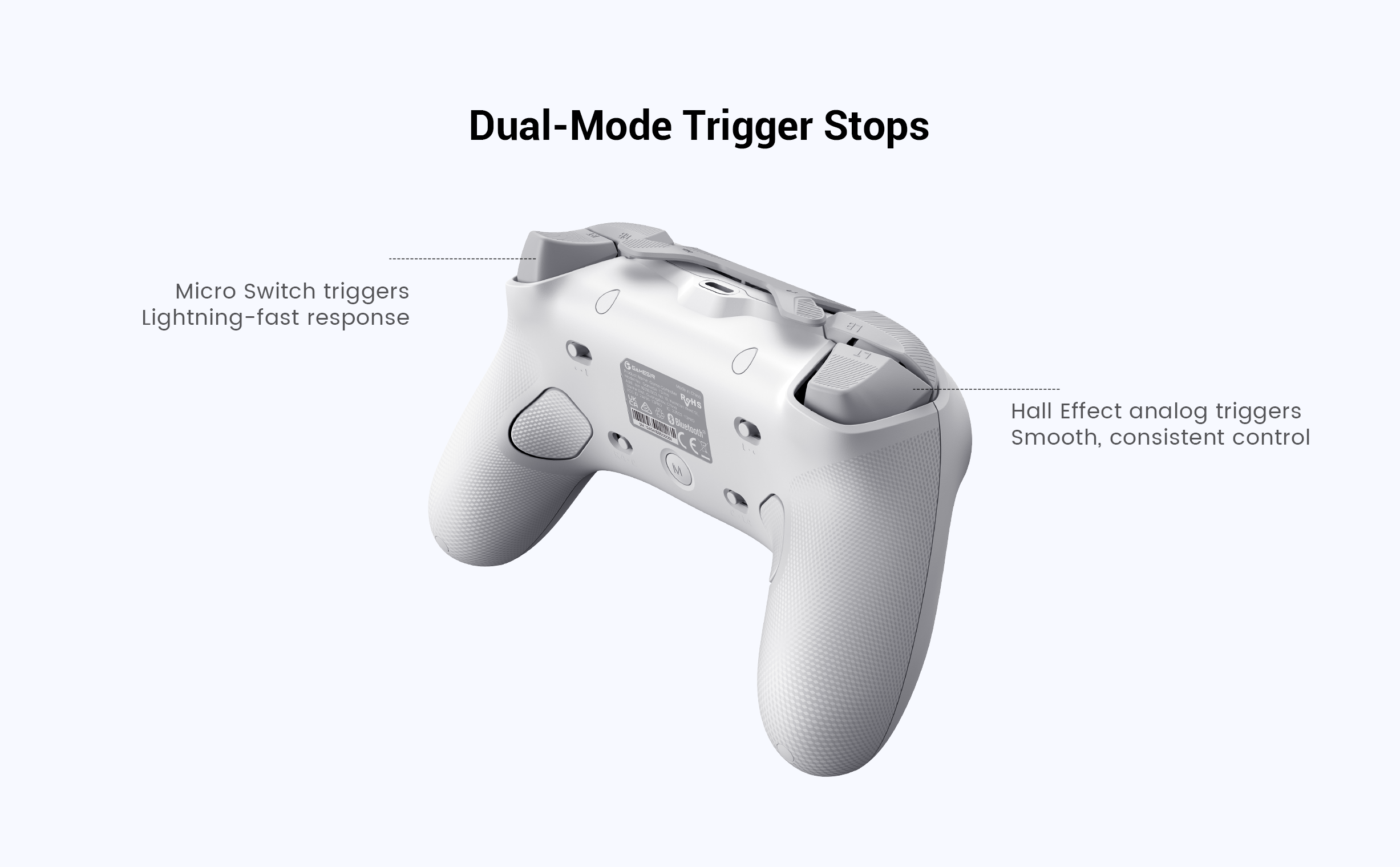 The Tarantula Pro for Xbox features dual-mode trigger stops, letting you switch effortlessly between Hall Effect analog triggers and micro switch triggers. Precision-tuned Hall Effect analog triggers deliver smooth, linear input for accurate control, while clicky micro switch triggers provide instant response. Whether you need precise linear control or ultimate responsiveness, it gives you the competitive edge.