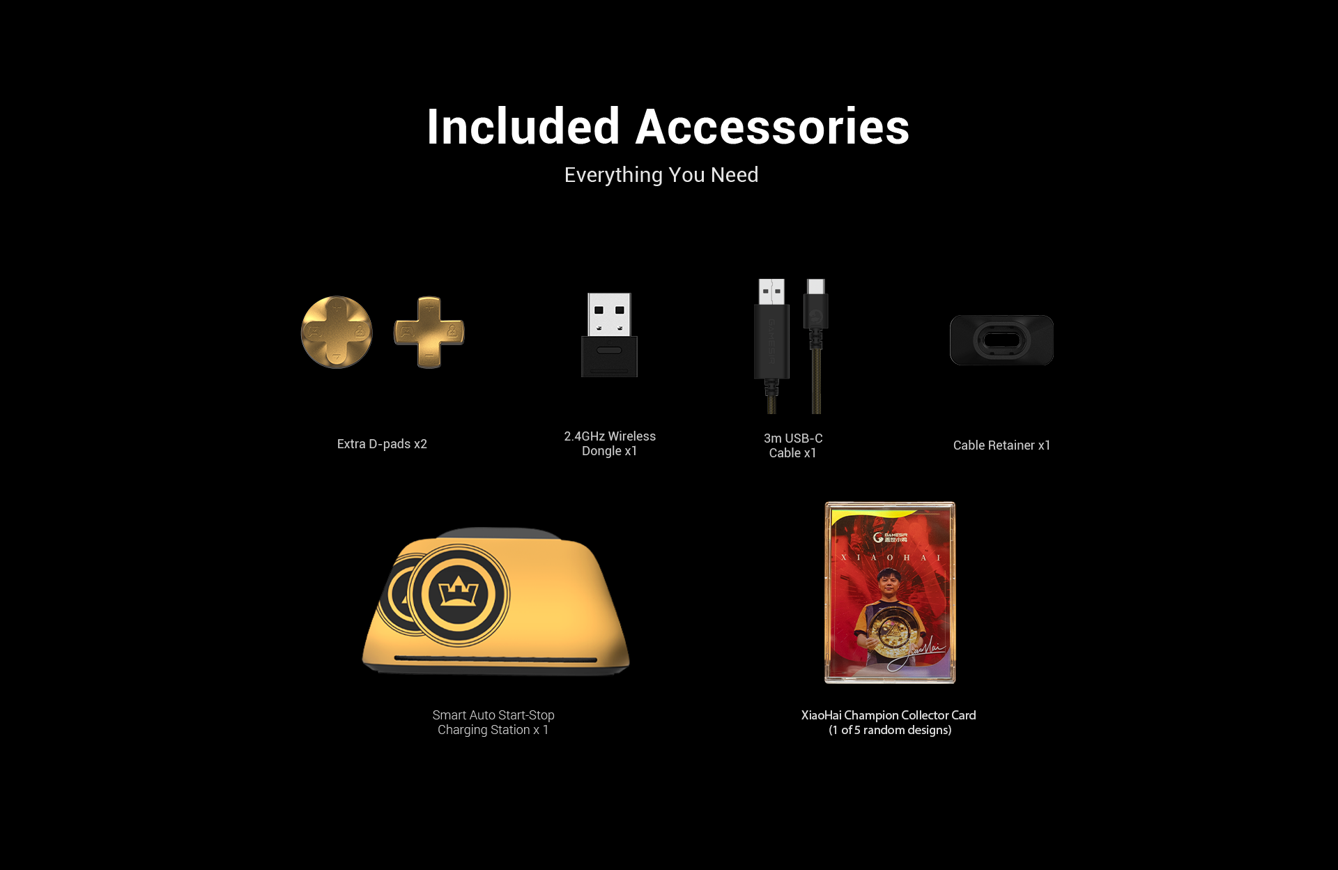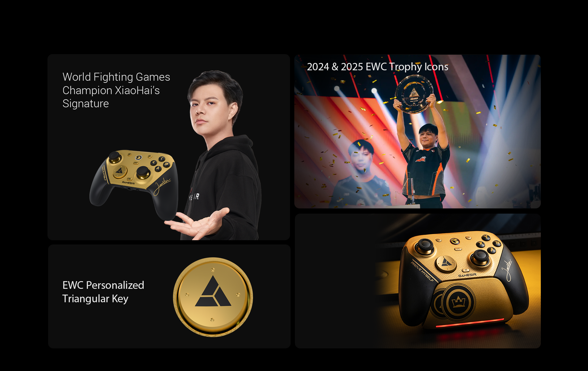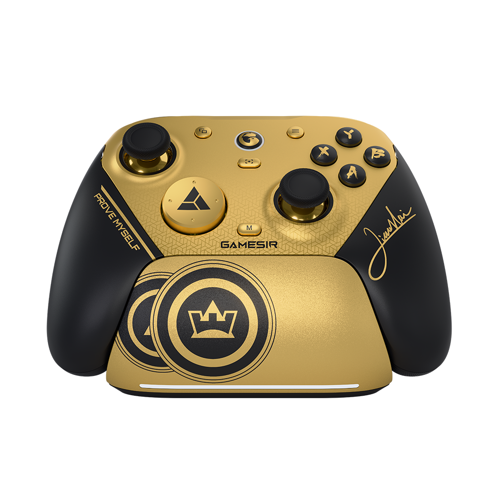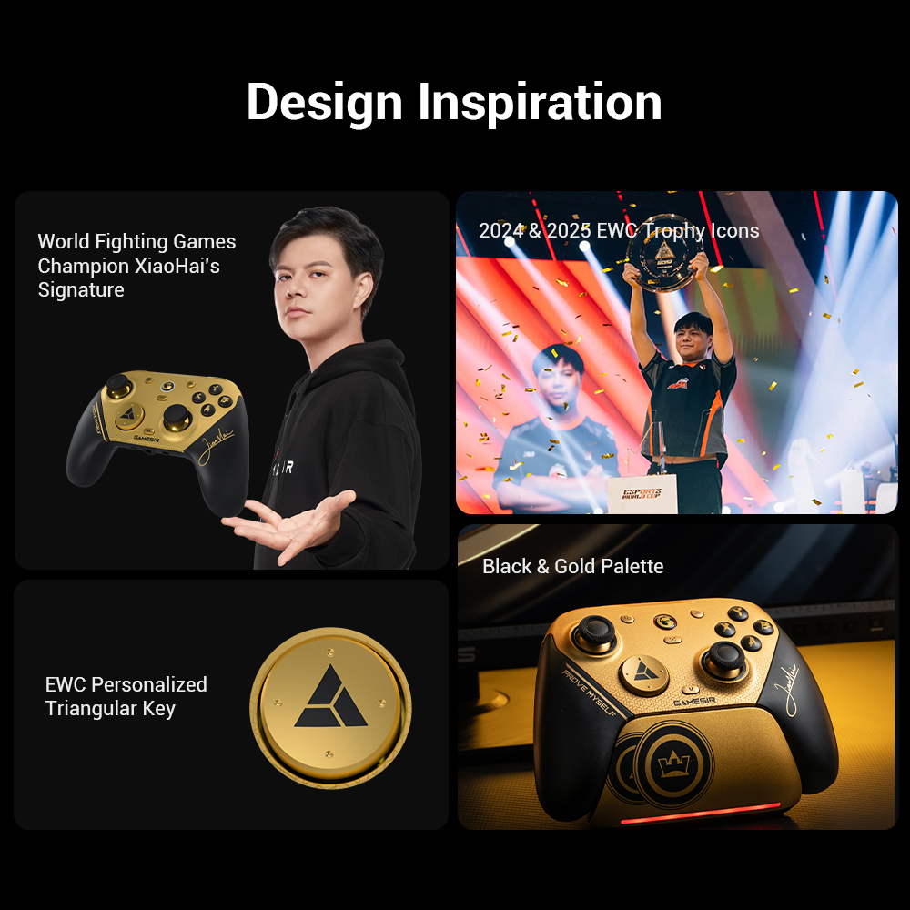 Inspired by our brand ambassador and world fighting game champion XiaoHai, this edition features a striking black & gold palette. The charging station showcases the 2024 & 2025 EWC trophy icons, while XiaoHai’s signature adorns the right grip. The D-pad is printed with the EWC personalized triangular key, completing a design made for champions.