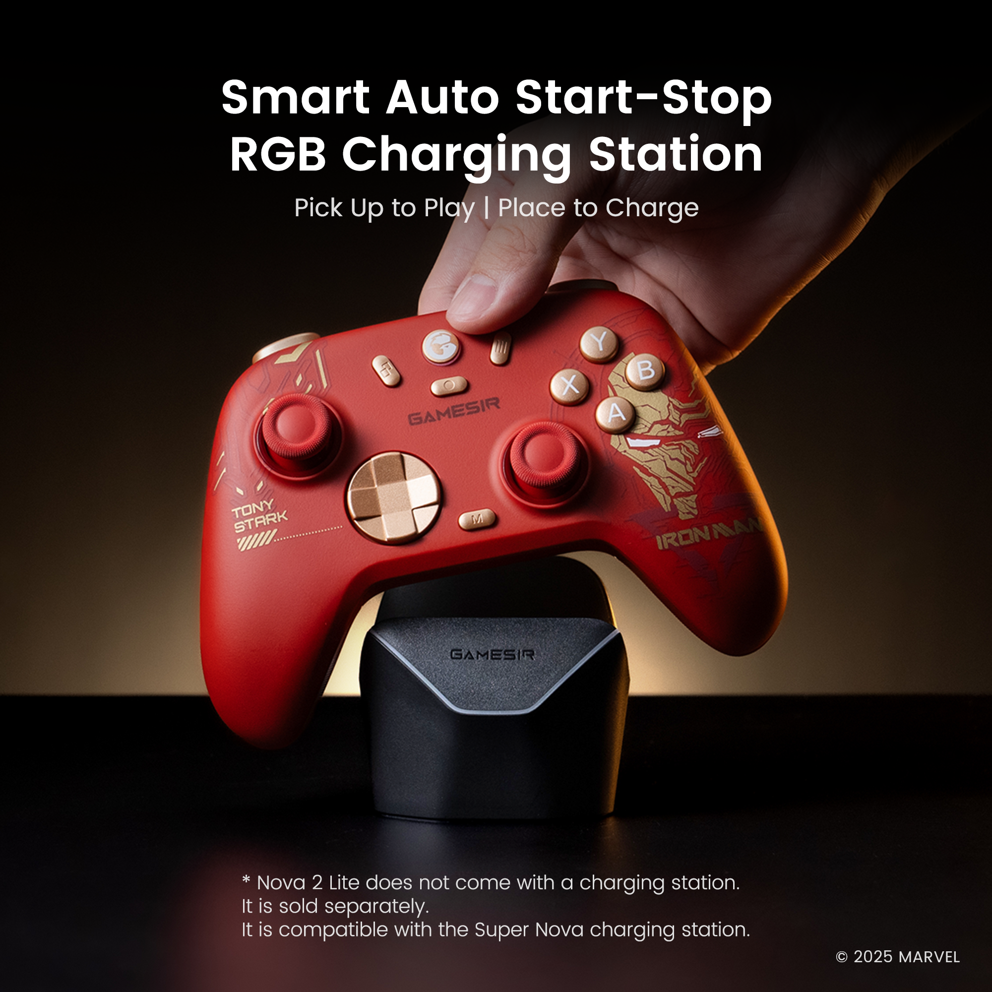 9. Smart auto start-stop charging station support-The Nova 2 Lite comes with a built-in 600mAh battery and supports a smart auto start-stop charging station (not included, sold separately; compatible with the Super Nova’s charging station). Simply pick up the controller to start playing, and when you're done, place it back on the station to recharge.