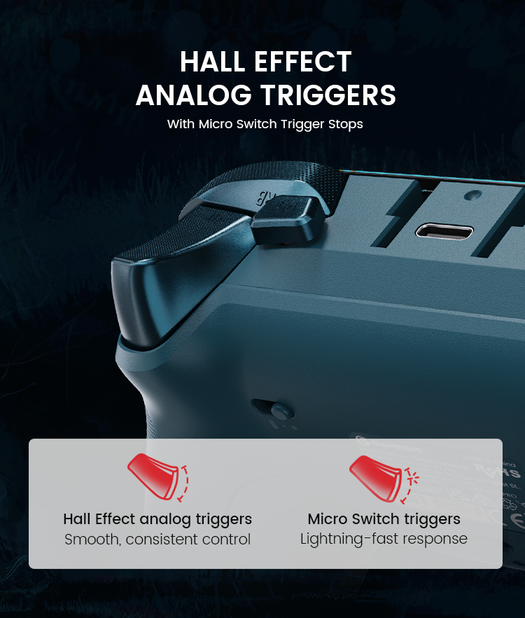 - Triggers: Hall Effect analog triggers with Micro Switch trigger stops